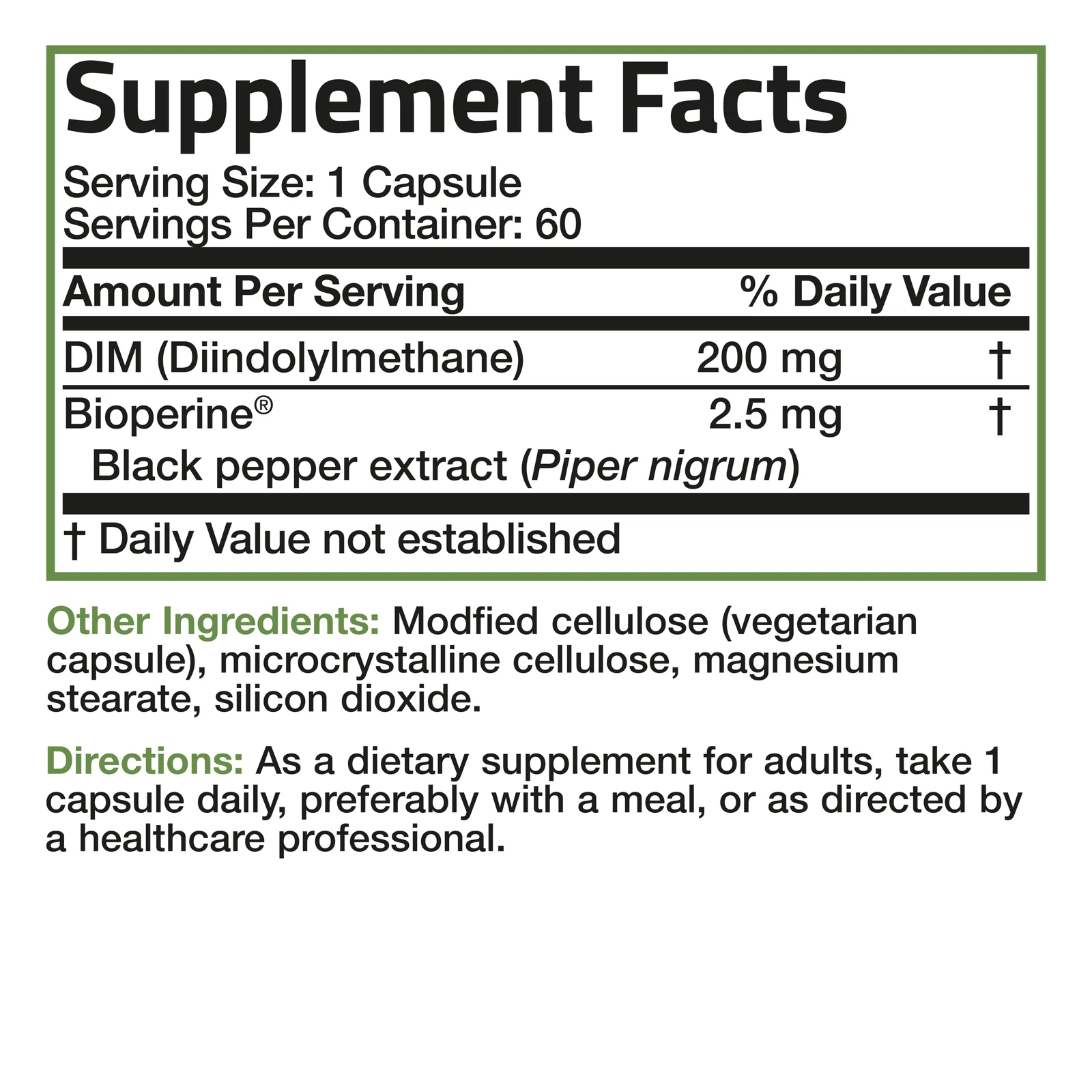 • Each capsule contains 200 mg DIM plus BioPerine for absorption