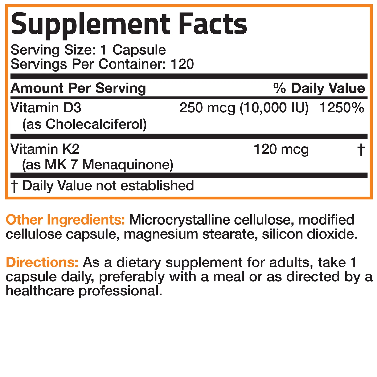 Vitamin K2 MK7 and Vitamin D3 combine to create a powerful supplement designed for bone and heart health. This natural pairing ensures calcium is efficiently absorbed and directed to the bones, while supporting flexibility and strength in the circulatory system. With 120 capsules per bottle, this Non-GMO formula makes daily wellness simple and effective.